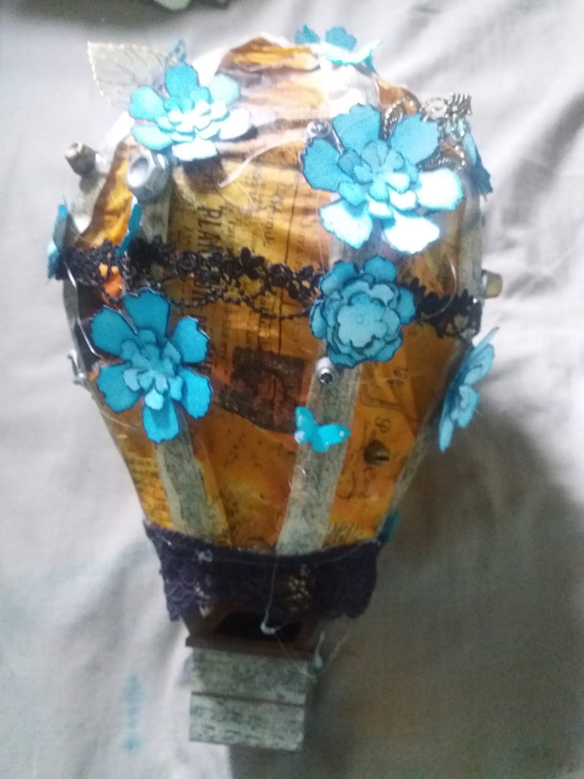 As I said, I've made something this week. I had a hot air balloon kit from craft box, so I started by painting it brown and assembling it. I then used rice paper to cover it in sections, and sprayed that with tin holtz distress ink sprays. I fortified the balloon with washi tape, which I also used to cover the basket. I then added some black lace on the balloon and the basket. I added some resin pieces that were coated with gold or silver wax, then die cut a load of flowers. These were coloured blue, and edged with black before assembling and adding to metallic leaves. Finally I sprayed some butterflies. I was going to coat them entirely but I liked the patchy effect. Oh almost forgot, I die cut a fan from card to add to the basket.